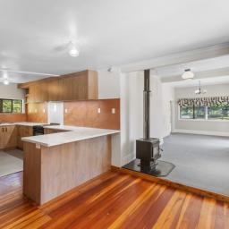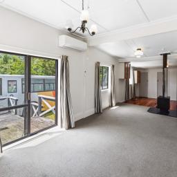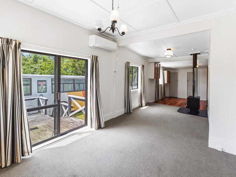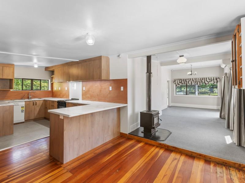 Step inside to a warm and inviting open-plan living area, complete with a fairly new kitchen and a heat pump for year-round comfort. The living space extends seamlessly onto a sun-soaked deck, the ideal spot to relax, entertain, or simply enjoy elevated views across your land.