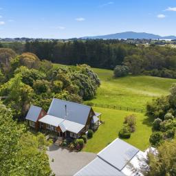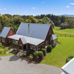Enchanting tree-lined driveway winds through native bush, leading to an elevated site featuring a unique character home over looking a lush rural landscape. The timber-clad house displays notable character and architectural appeal.