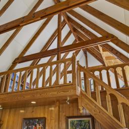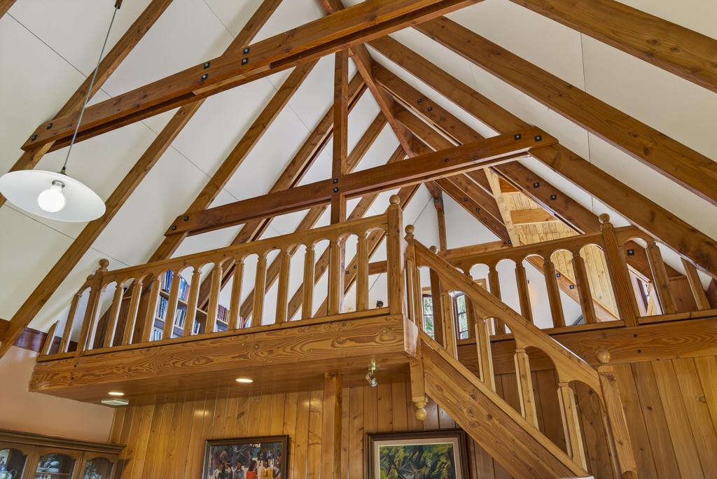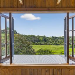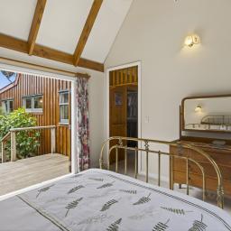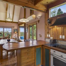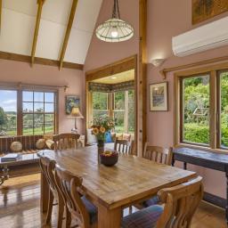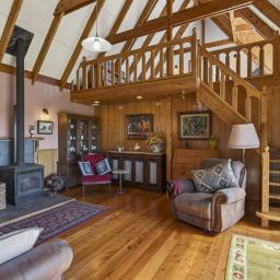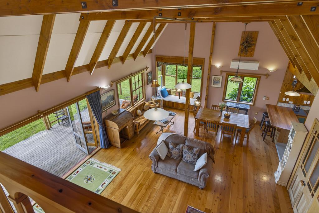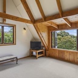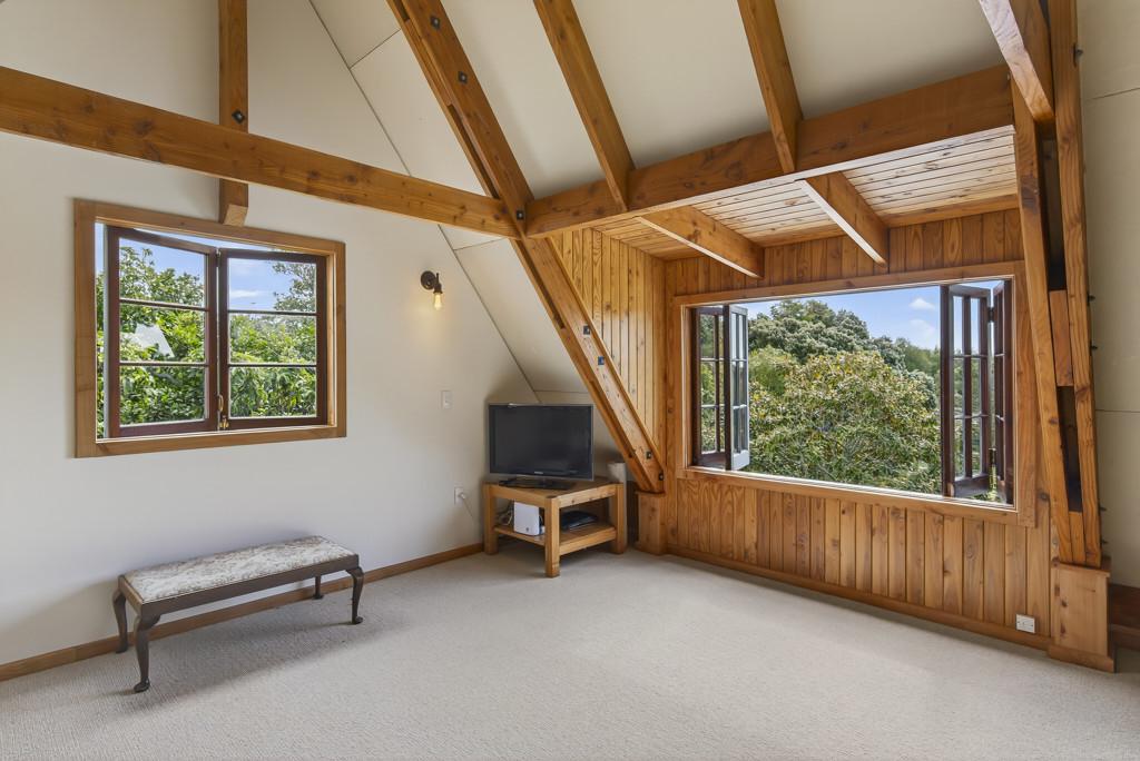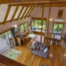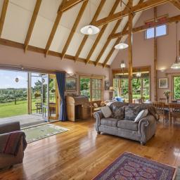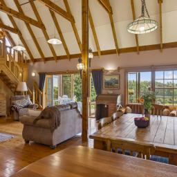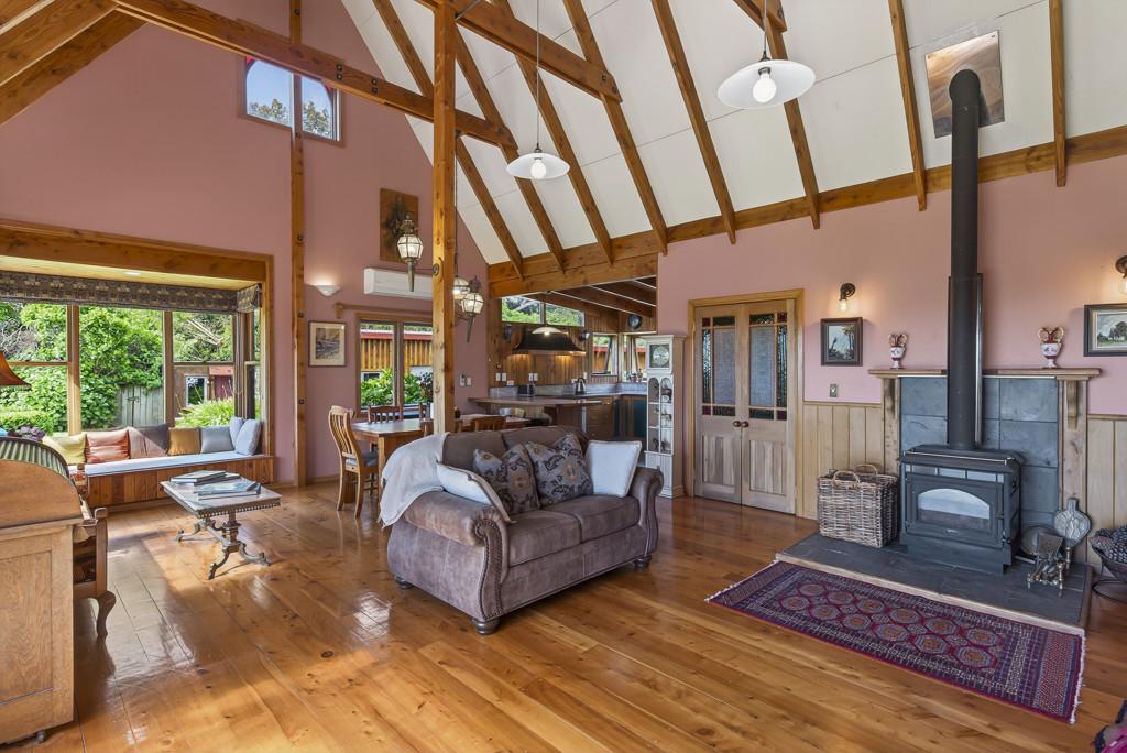This property features striking steeple roofs and soaring chapel ceilings, complete with exposed timber trusses and rafters. Warm golden macrocarpa floors flow throughout the spacious open-plan living area, creating an inviting and warm atmosphere. Expansive bifold doors lead to a large covered deck, seamlessly extending the living room into the outdoor space. Upstairs, the mezzanine serves as a versatile area for a second lounge, a reading nook, or a study, highlighted by feature bifold windows and panoramic views.