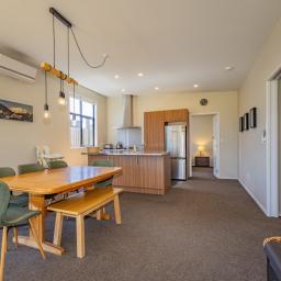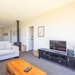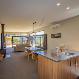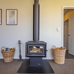 The living area is very spacious with huge sliders opening on to a large wrap around deck with super indoor outdoor flow. And there are great mountain views from the sunny deck. The open plan living has both a heat pump and a wood burner to keep you cosy in the winter months, especially with the added features of double glazing and excellent insulation.
