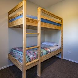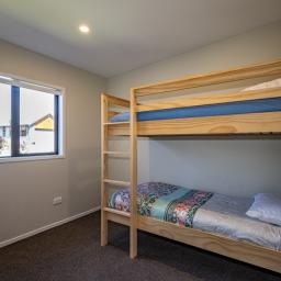 Bedroom one is the bunkroom and a second is a double, both with built-in wardrobes, and these rooms share a spacious bathroom with bath, shower, vanity and toilet. The laundry is concealed at the entrance to the house. And at the far end of the house is a roomy master bedroom with an ensuite and walk-in wardrobe.