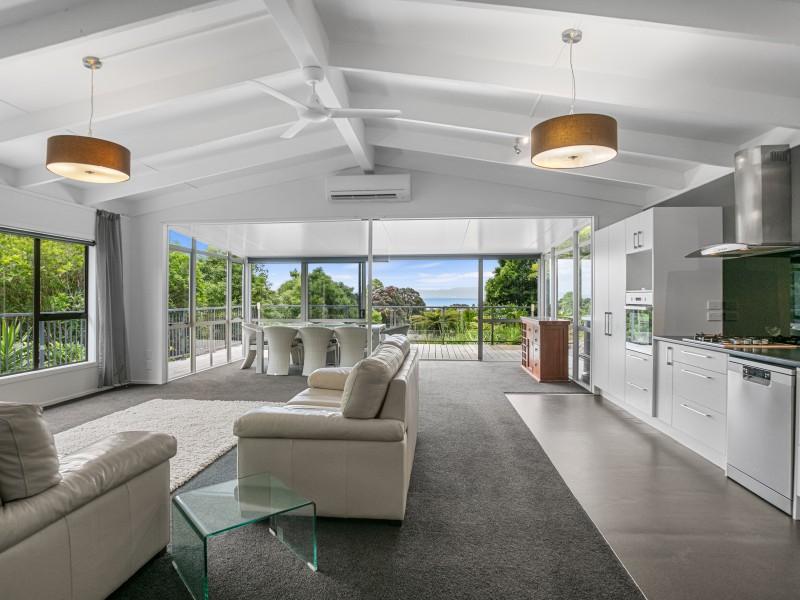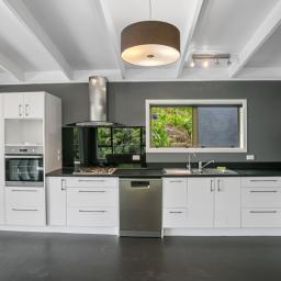 A modern kitchen with open plan living spaces  that flow out onto a wrap around deck where you can lounge and enjoy the amazing view and watch the sunsets.