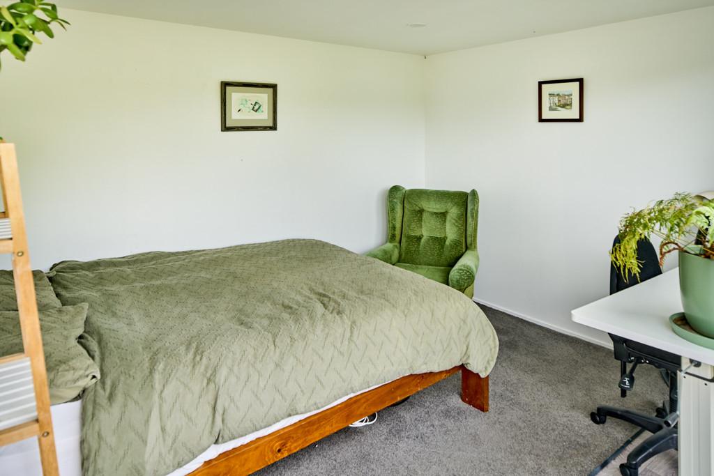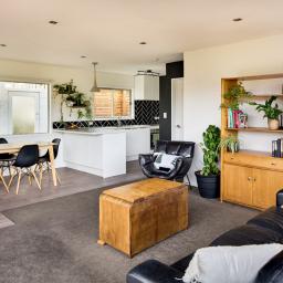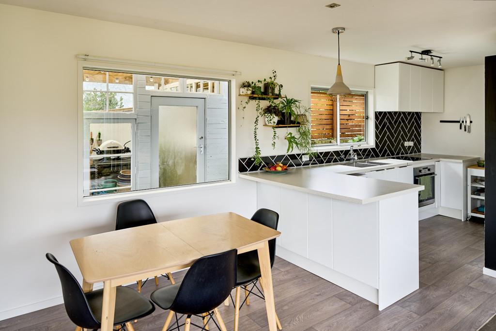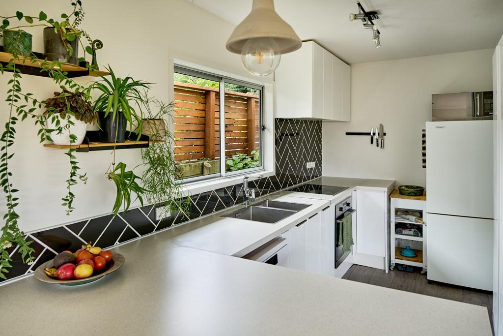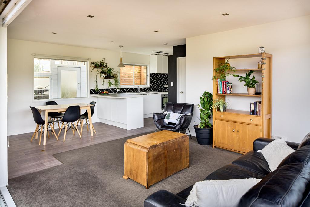 At the heart of the open-plan living area sits a well-appointed, stylish kitchen, perfectly positioned to serve the dining and living spaces. Two generous bedrooms are complemented by an additional office or sleep-out, externally accessed via the rear of the garage. A separate laundry adds further practicality