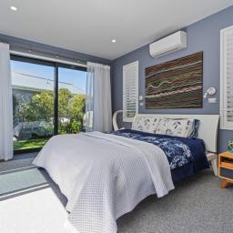> the comfort of two heat-pump/air-conditioners, gas-fire, heated flooring, HRV (three-unit) ventilation, security system: cosy, warm, cool, ambient, dry & secure