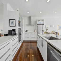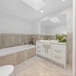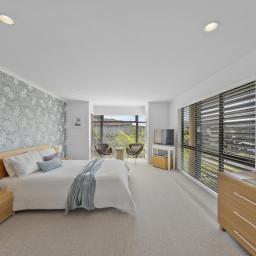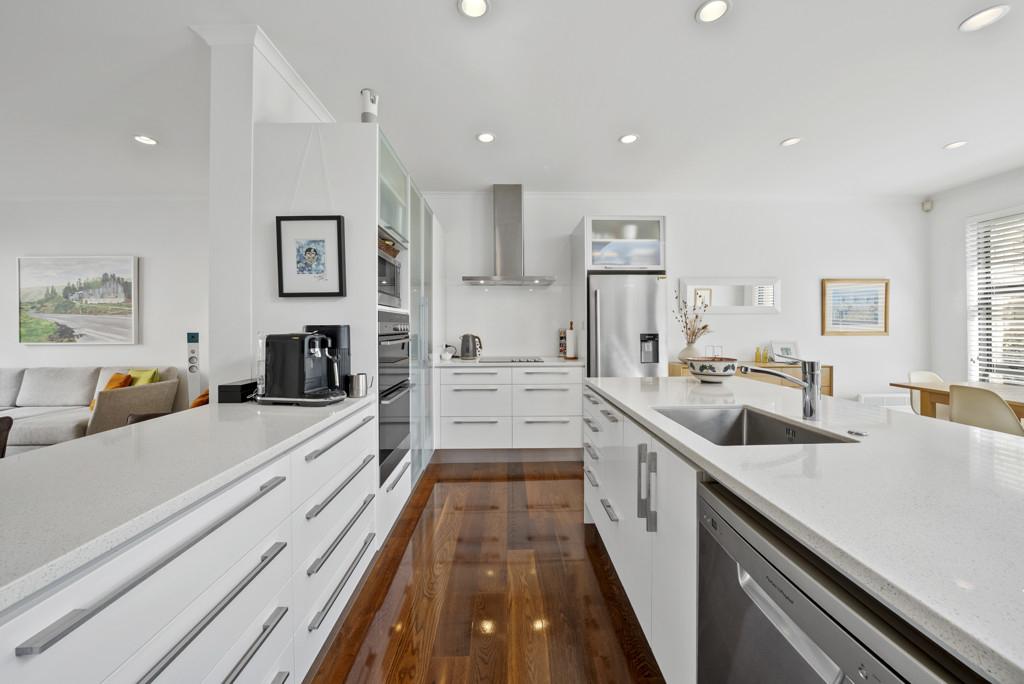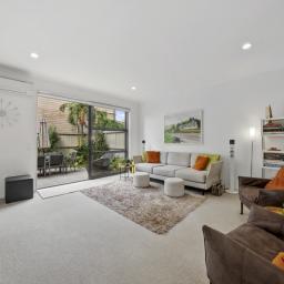 Outside, a private courtyard and low-maintenance garden provide an inviting space for entertaining or enjoying quiet moments in the sun. Light-filled interiors are enhanced by views of Mt Wellington and thoughtful modern finishes throughout, creating a warm and refined atmosphere.
