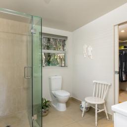 The lower level is arranged with three generous bedrooms, each with built-in storage and direct outdoor access. One bedroom features its own ensuite, while a Jack-and-Jill bathroom services the remaining rooms. This level has previously operated successfully as an Airbnb, offering the flexibility to live upstairs while generating income below.